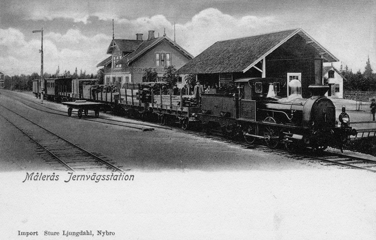 Målerås station. Nybro - Sävsjöströms Järnväg, NSJ lok 1 "Orrefors" med blandat tåg.