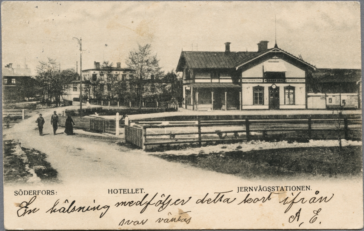 Söderfors järnvägsstation. I bakgrunden syns Söderfors hotell.