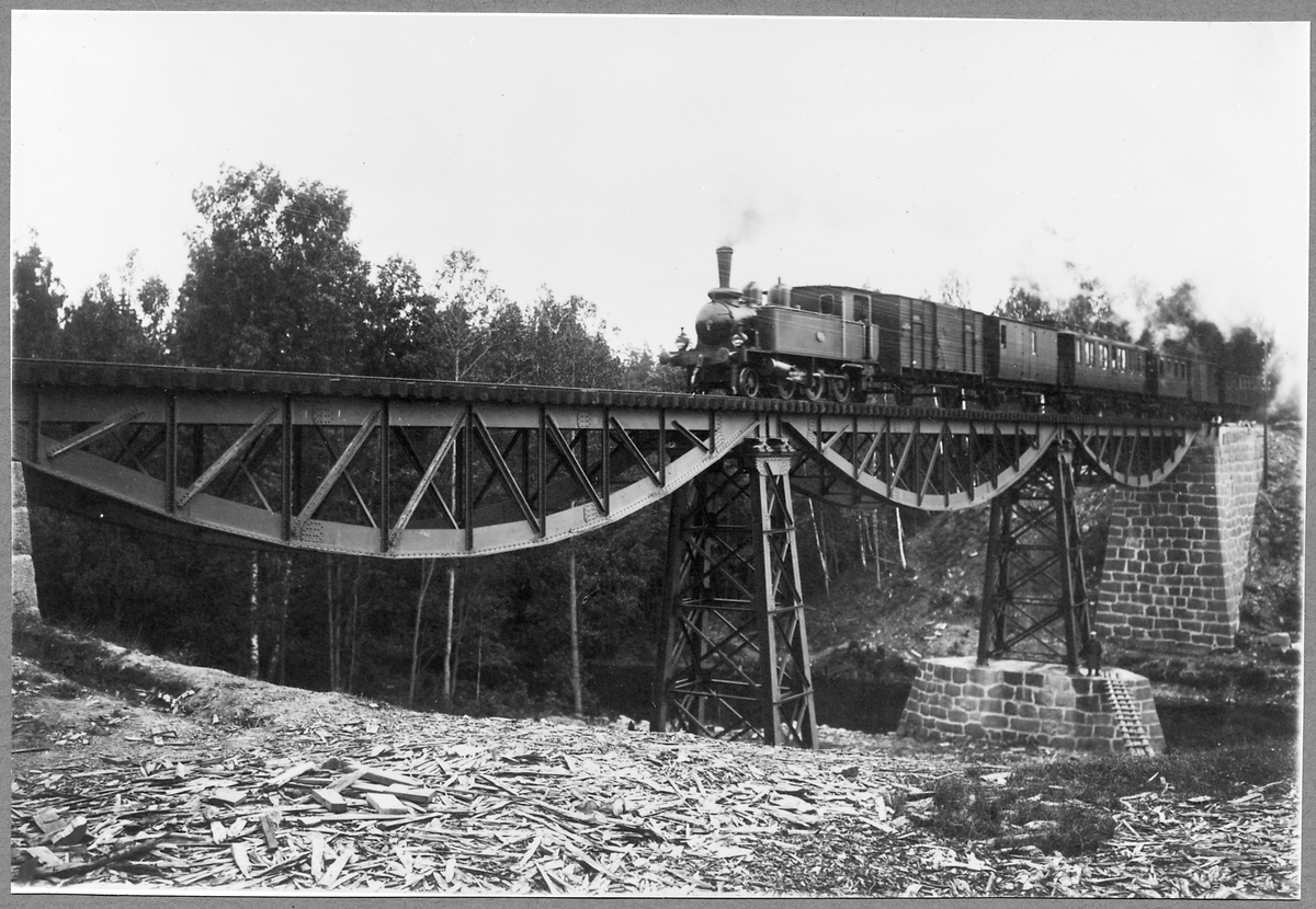 Nora Karlskoga Järnväg, NKJ lok 11 passerar på bron över Järleån på linjen mellan Järle och Lilla Mon.