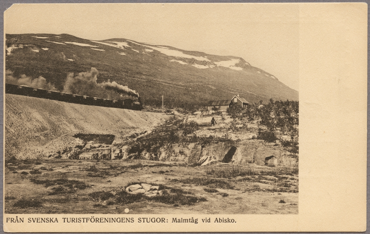 Vy på berg och godståg med malm.