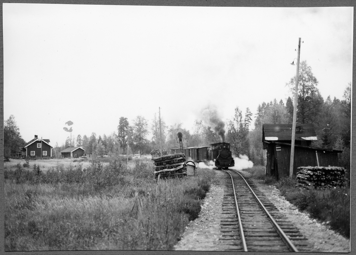 Ånglok med godståg och passagerare i dom öppna godsvagnarna.