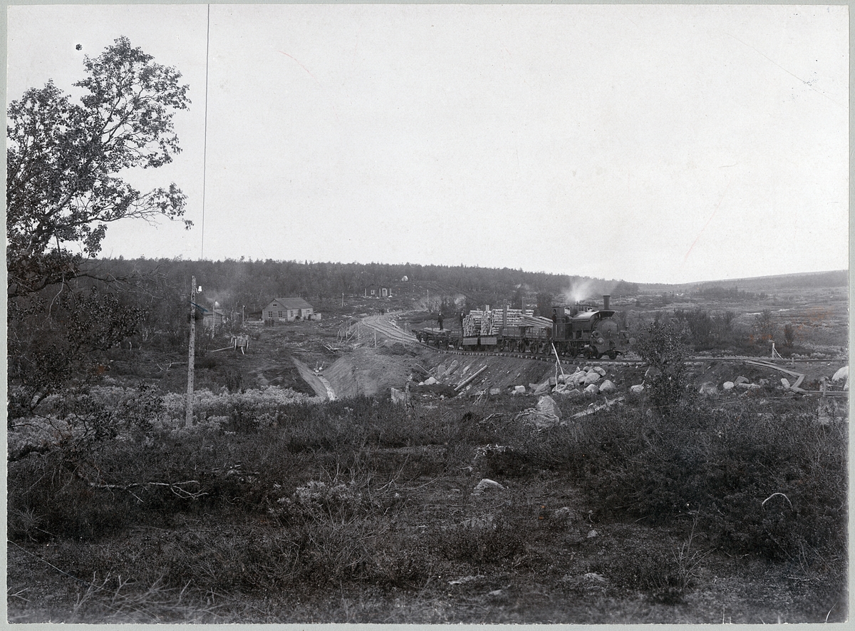 Bilvande järnvägslinjen mellan Gällivare - Kiruna under byggnad, rälsläggningståg år 1900. Ångloket på bilden är Statens Järnvägar, SJ Qå 446, före detta Sverige & Norge Järnväg S&NJ lok 16.