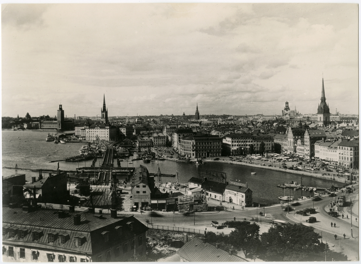 Stockholm utkik från Katarinahissen 1930, innan slussbygget påbörjades och hissen rivits. Denna utsikt är numera historisk. Gamla riksdagshusets flygel mot Mälaren påbyggd och fullbordas 1908 efter ritningar av frun jonasson. Uppgift från stadsmuseets bildarkiv i 1956 06 12.
