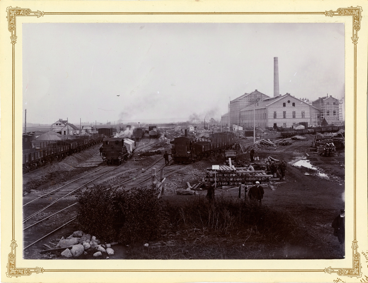 Lyckåkers Sockerfabriksbyggnad i Hasslarp. Loket till vänster i bild tillhörde Statens Järnvägar och hade littera SJ M 373. Loket till höger tillhörde Skåne - Hallands Järnväg och hade littera SHJ lok 9.