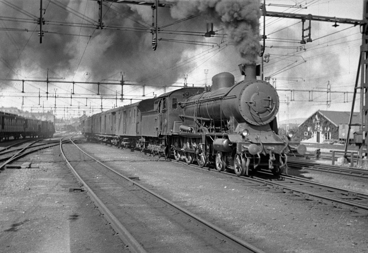 Bergslagernas Järnvägar, BJ H3 63 med snälltåget "Dalaexpressen" Vagnarna närmast är resgodsvagn BJ F3 samt en kombinerad resgods- och postvagn BJ DF0.