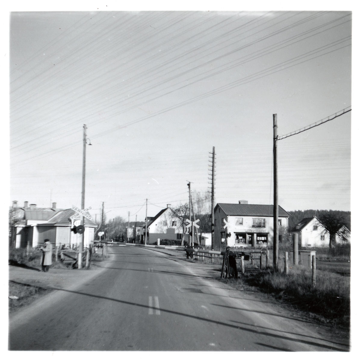 Järnvägsövergång i Rosenfors med en bensinmack till vänster och affär till höger.