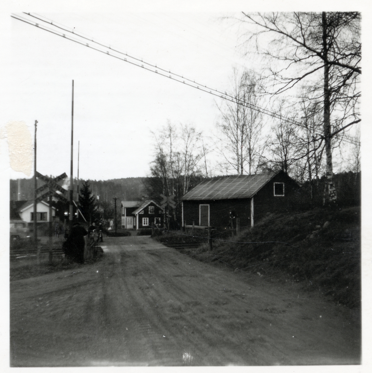 Järnvägsövergång i Mörlunda med uthus och barn.