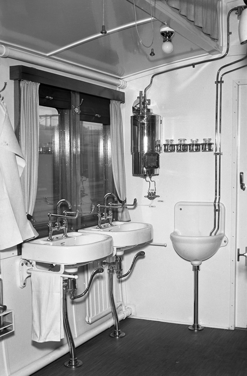 Sjukhuståg visat vid utställningen SJ i försvarets tjänst. Tvättställ i ambulansvagn.