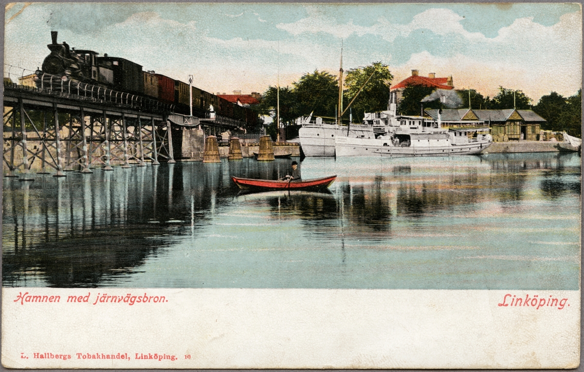 Båt och tågtrafik vid järnvägsbron över Stångån.