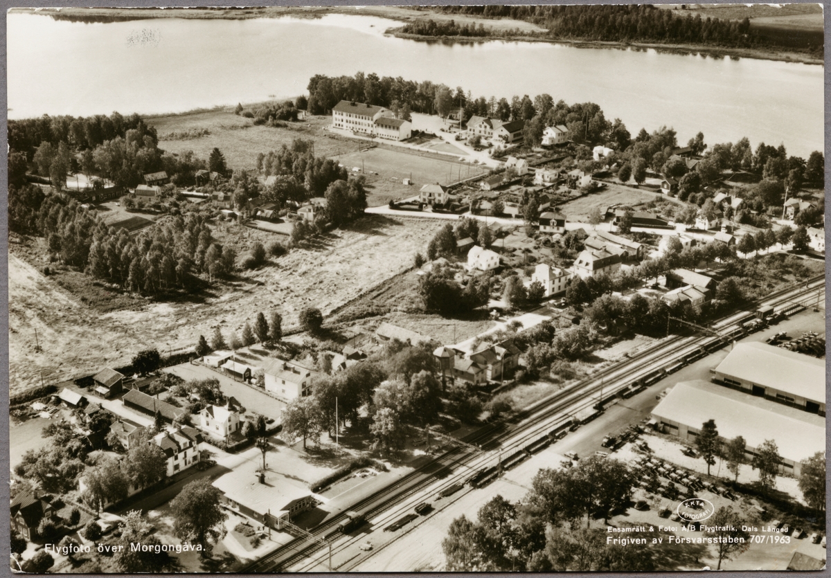 Morgongåva fotograferat från flygplan, längst ner i blid skymtar järnvägsstationen.
