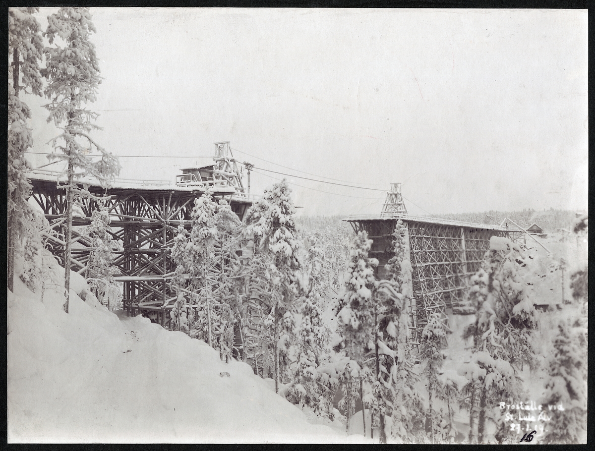 Bron över Stora Lule Älv längs Inlandsbanan under byggnationen.