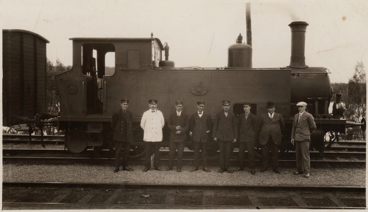 Personal i Grängesberg uppställda framför Frövi - Ludvika Järnväg, FLJ lok 22.