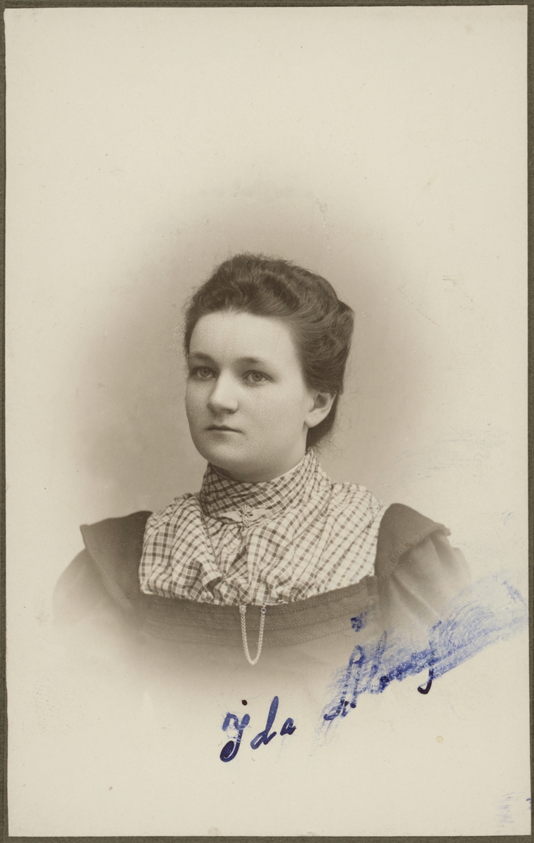 Porträtt av Ida Åhberg, halvsyster till Axel Åberg. Axel var aktiv inom Trafikaktiebolaget Grängesberg - Oxelösunds Järnvägar, TGOJ.