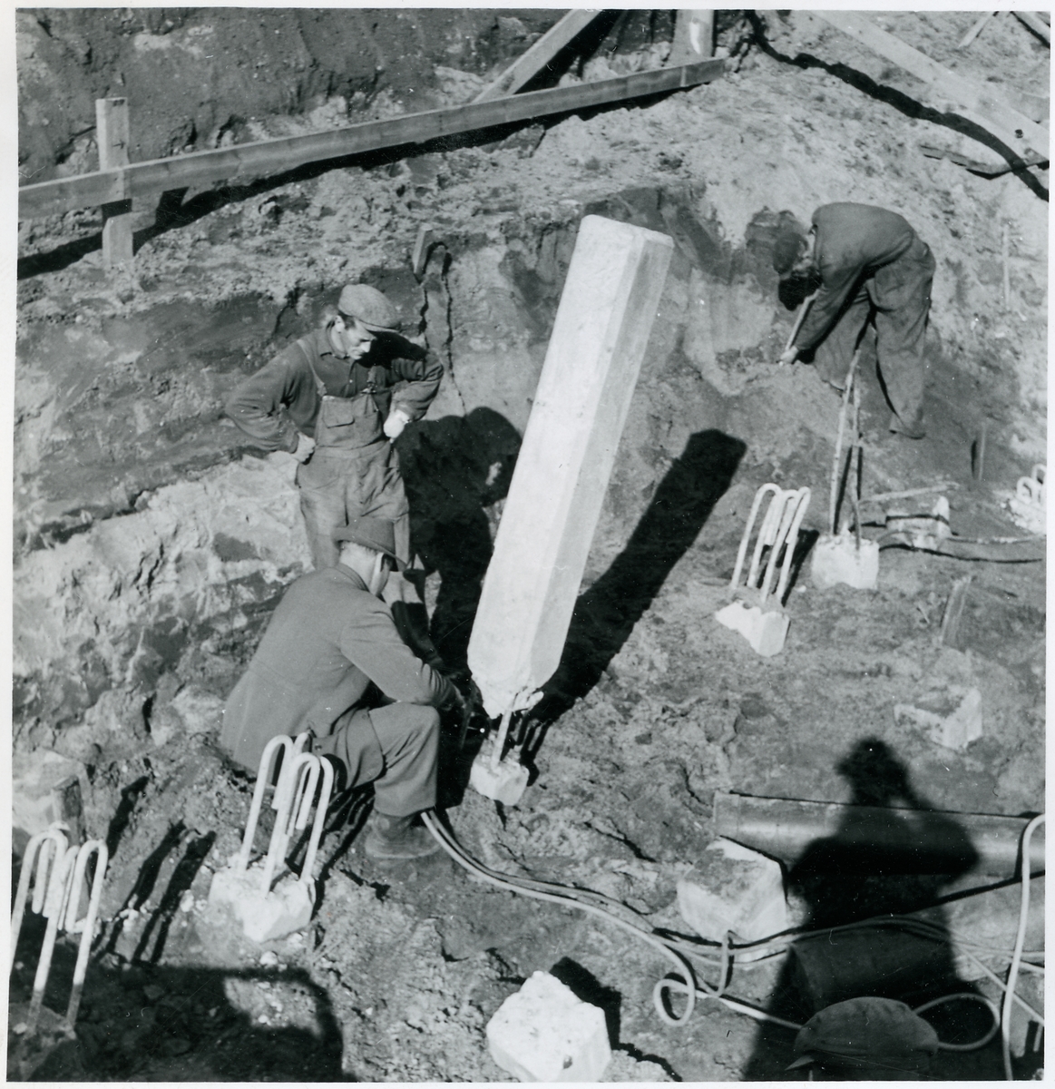 Verkmästaren skär bort den övre delen av pålen med gas, vid Skövde.