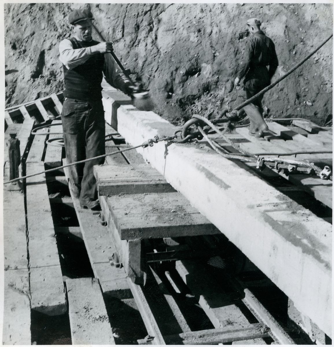 Pålen på vägportsbygget i Skövde borstas av för upphissning.