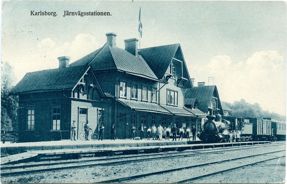 Resande och stationspersonal på Karlborgs Järnvägsstation