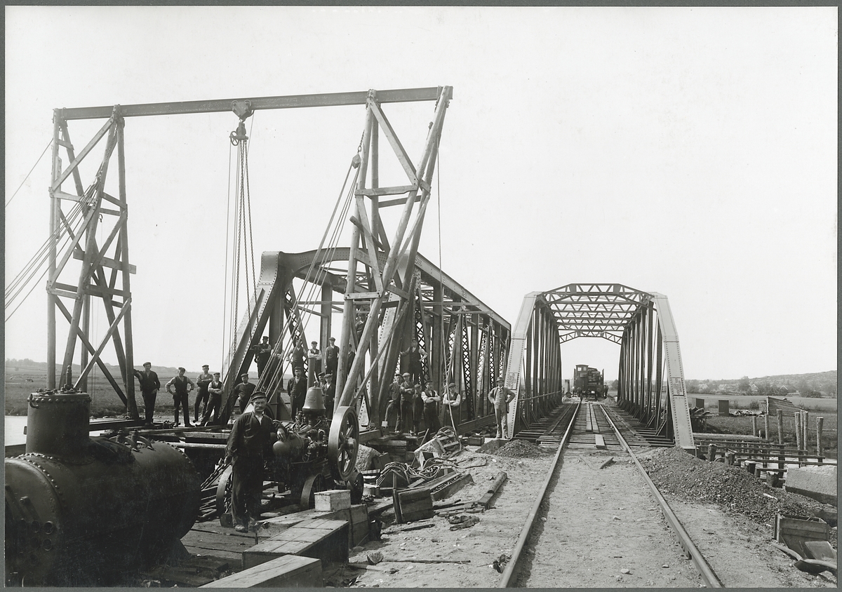 Byggnation av järnvägsbro över Viskan på linjen mellan Åskloster och Värö. Till vänster syns den ursprungliga bron från 1887.