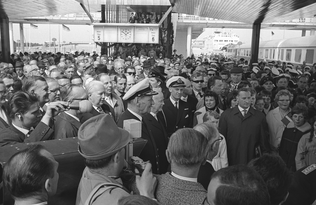 Invigning av "Fågelvägslinjen" mellan Rodbyhavn, Lolland, Danmark och Puttgarden, Fehmarn, Tyskland. Den nya färjelinjen kallas "Fågelvägslinjen", på danska Fugleflugtslinien och på tyska Vogelflugslinie, eftersom linjen följer flyttfåglarnas flygrutt. Danmarks kung Frederik IX, i mitten i profil