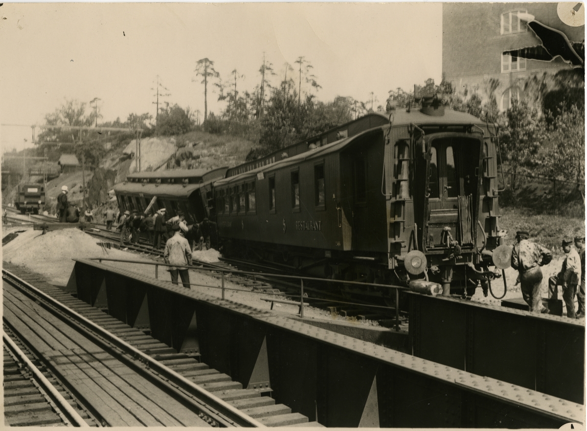 Tomteboda station. Statens Järnvägar, SJ. Urspårningen i Tomteboda. Närmast i bild syns restaurangvagn SJ ABo3 2466 och nästa vagn är en sittvagn SJ Bo4a.
