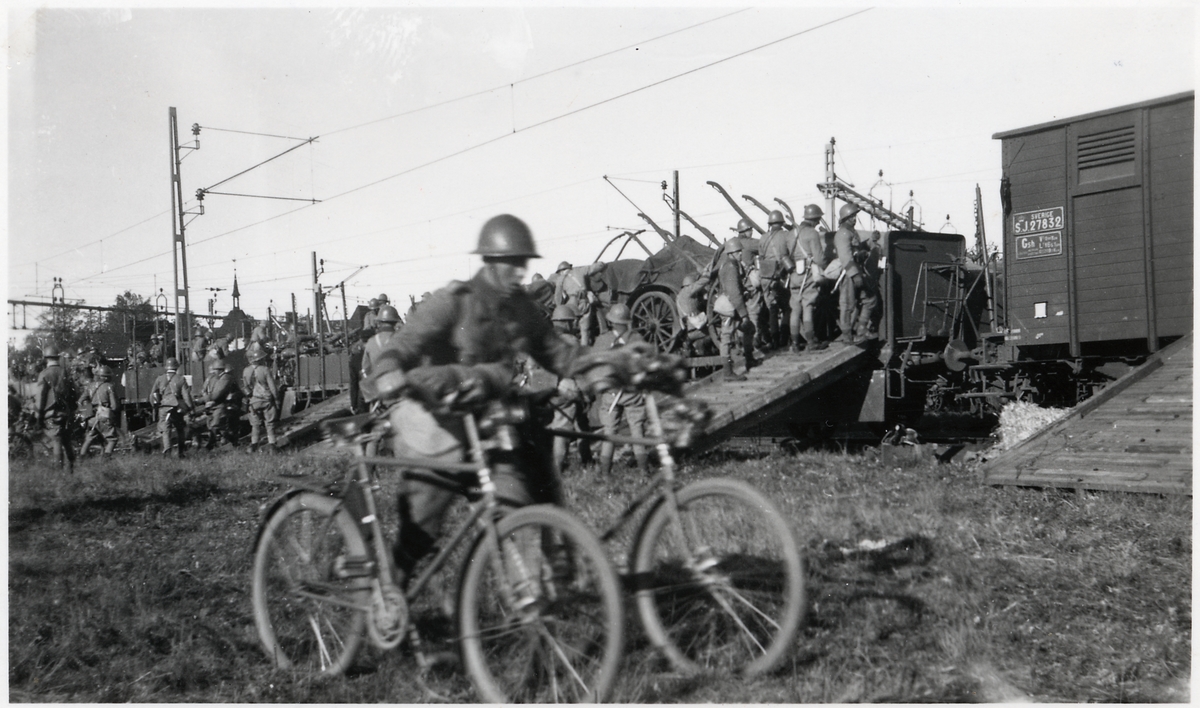 Cyklar och kärror lossas. Godsvagn Statens Järnvägar, SJ G 27832.