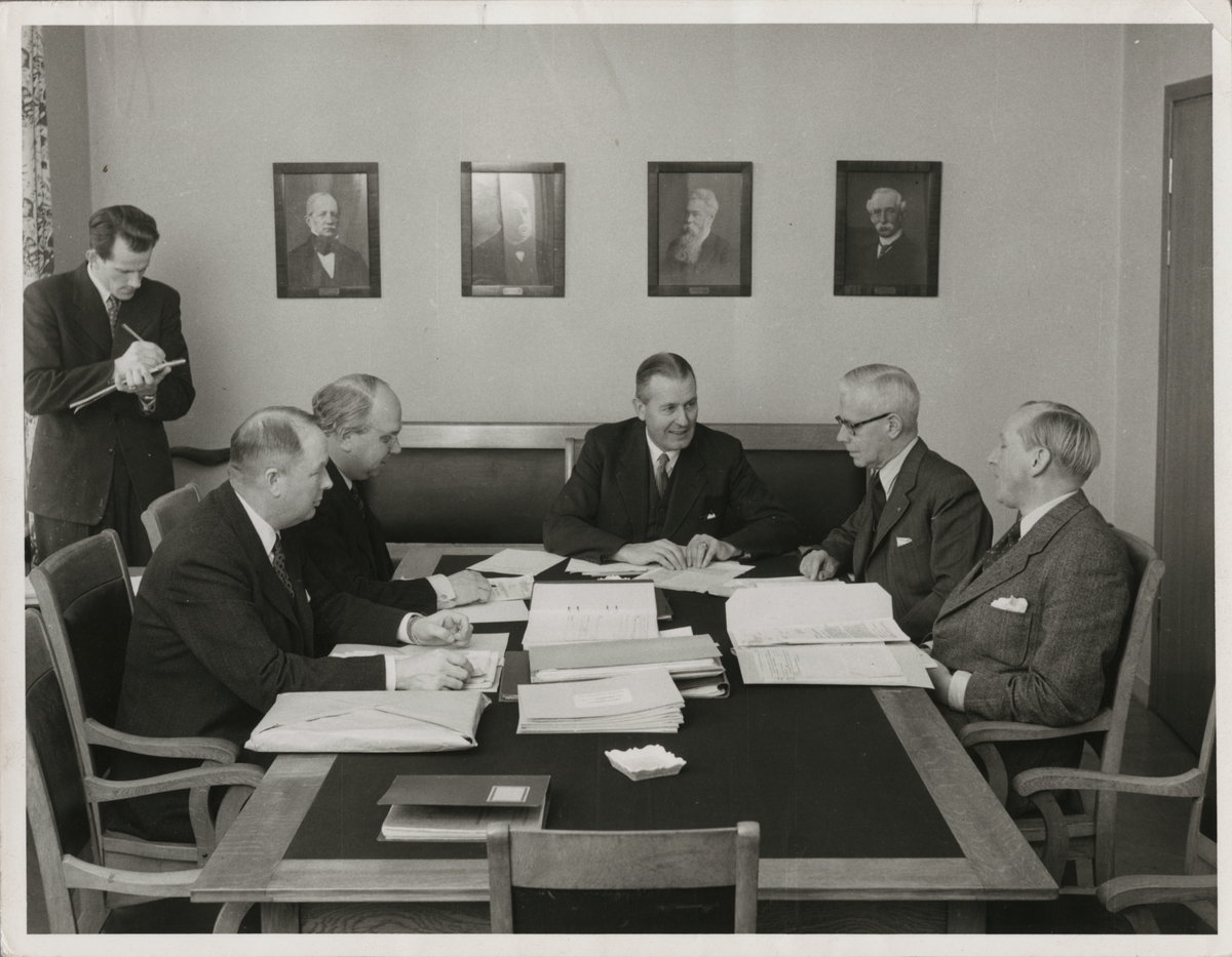 Trafikaktiebolaget Grängesberg - Oxelösund, TGOJ. Förvaltningsmedlemmar samlade runt ett bord. Från vänster: Gunnar Bergström, Sture Nortorp, Bo Ytterberg, Lars Granfeldt, Sven Lagergren och Åke Karlström.