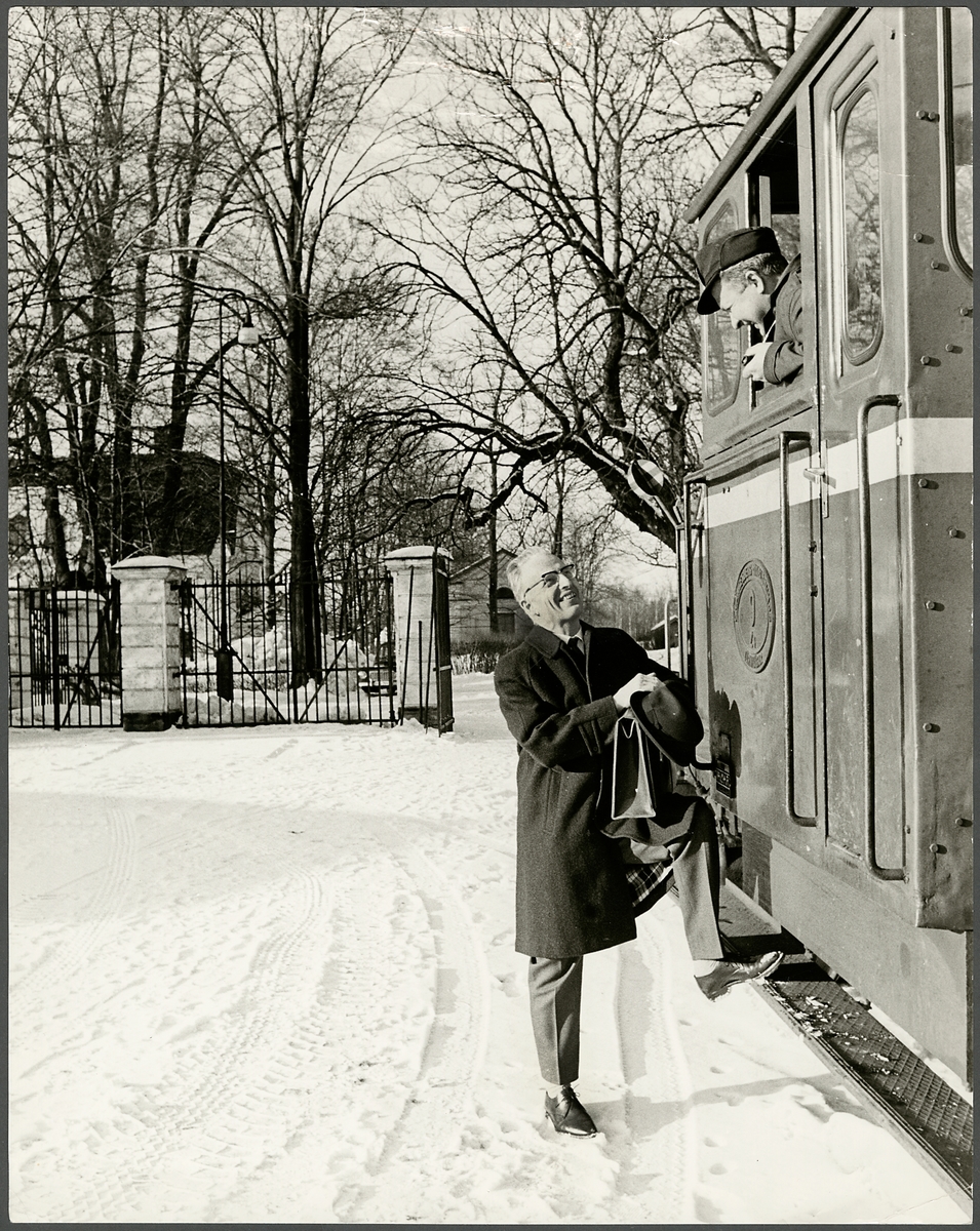 Trafikaktiebolaget Grängesberg–Oxelösunds Järnvägar, TGOJ Z4 9 på väg in på AB Järnförädlings industriområde. I lokomotorns förarhytt sitter stationsförman Anders Olsson, stående utanför syns bruksdisponent Hans Rudberg.