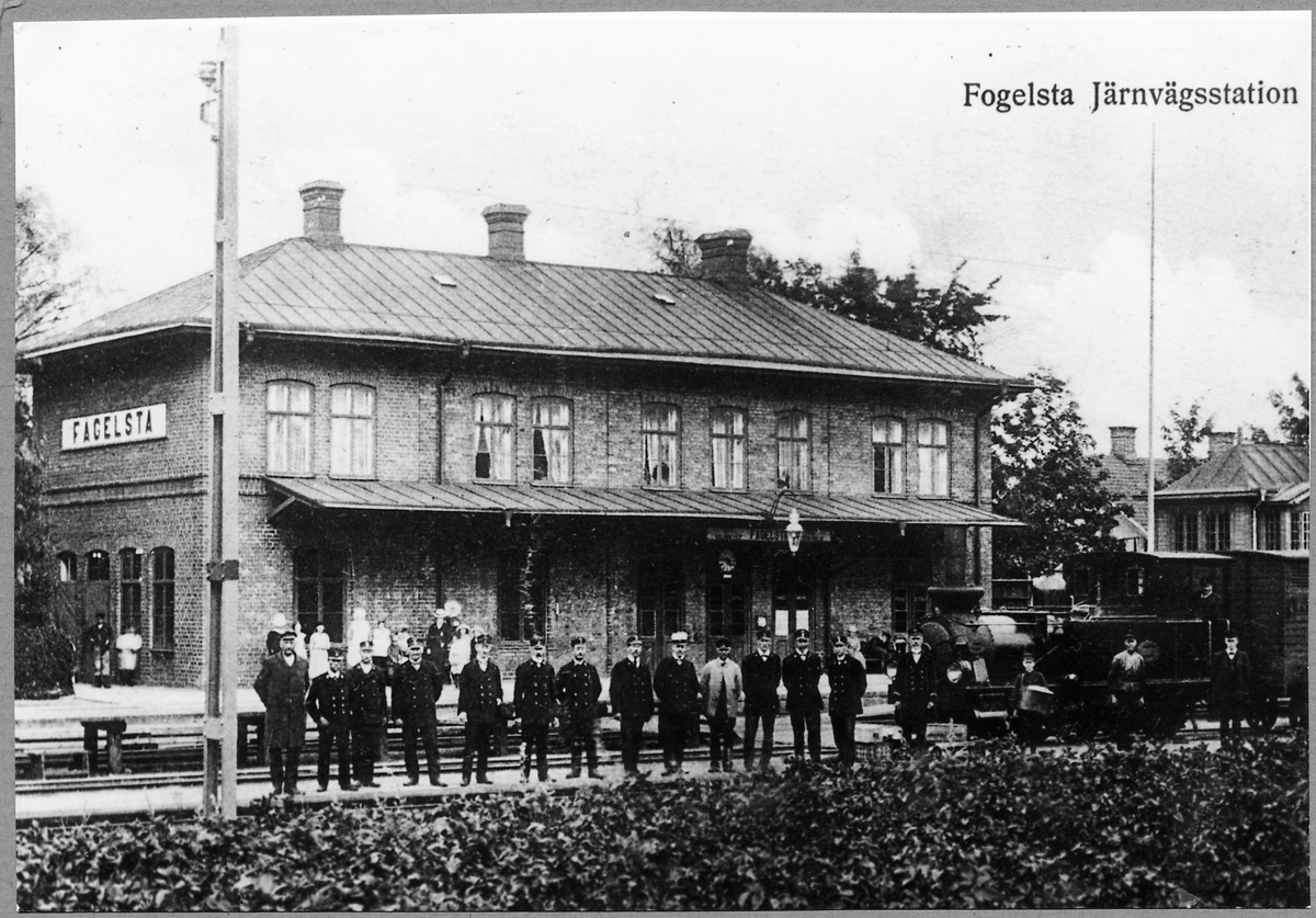 Personal vid Fågelsta station. Fågelsta-Vadstena-Ödeshögs Järnväg, FVÖJ lok 1 "Ettan".