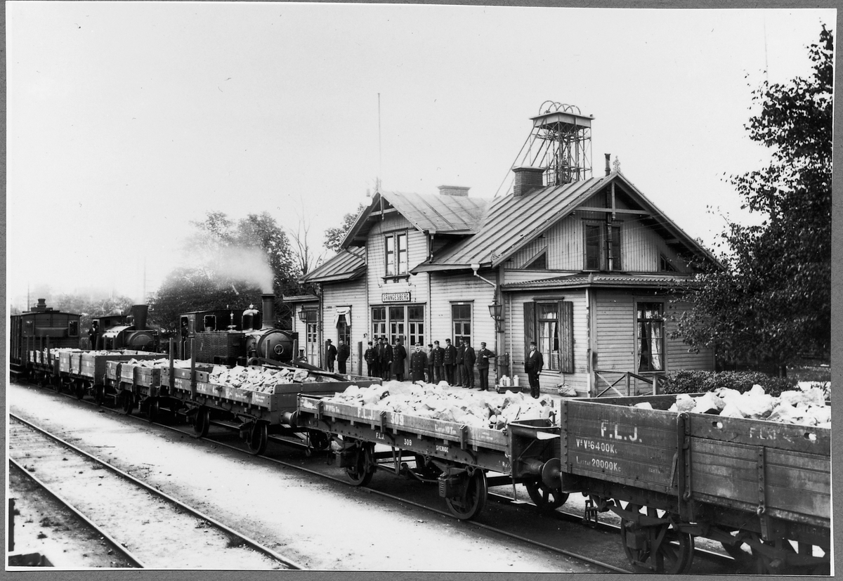 Grängesberg C station med Frövi - Ludvika Järnväg, FLJ lok 18, FLJ lok 4 "Rosina" och FLJ malmvagn 309.