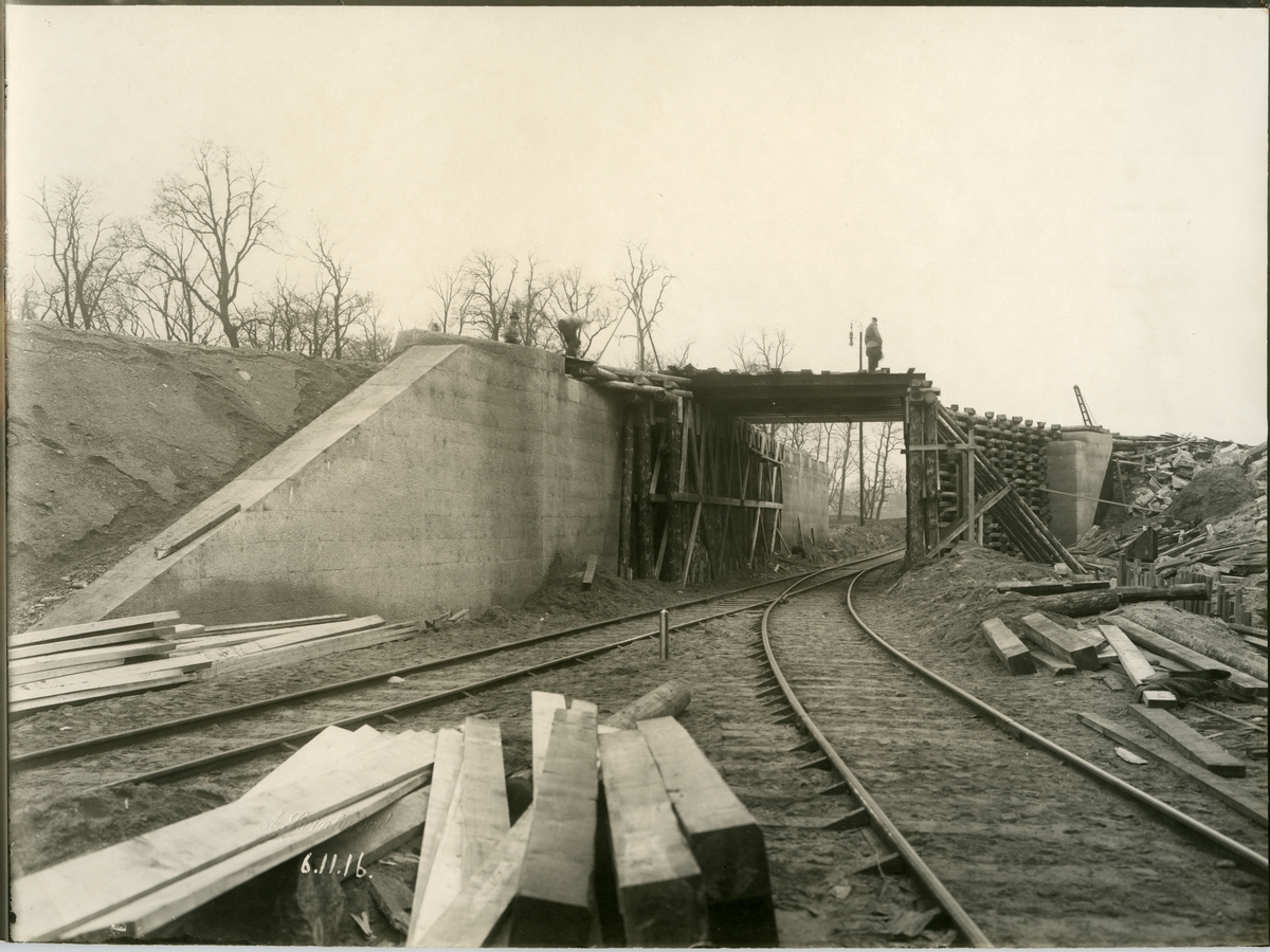 Tomteboda. Statens Järnvägar, SJ. På linjen, Karlberg-Tomteboda, Ke-Tm. Viadukt över spåret Tomteboda- Värtan, Tm-Vn. Provisorisk övergång för huvudspåren.