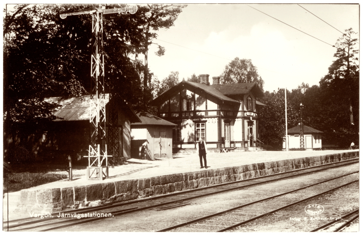 Kontaktledningen som syns avser spåret till Vargöns bruk där man införde ellok som dragkraft 1912.