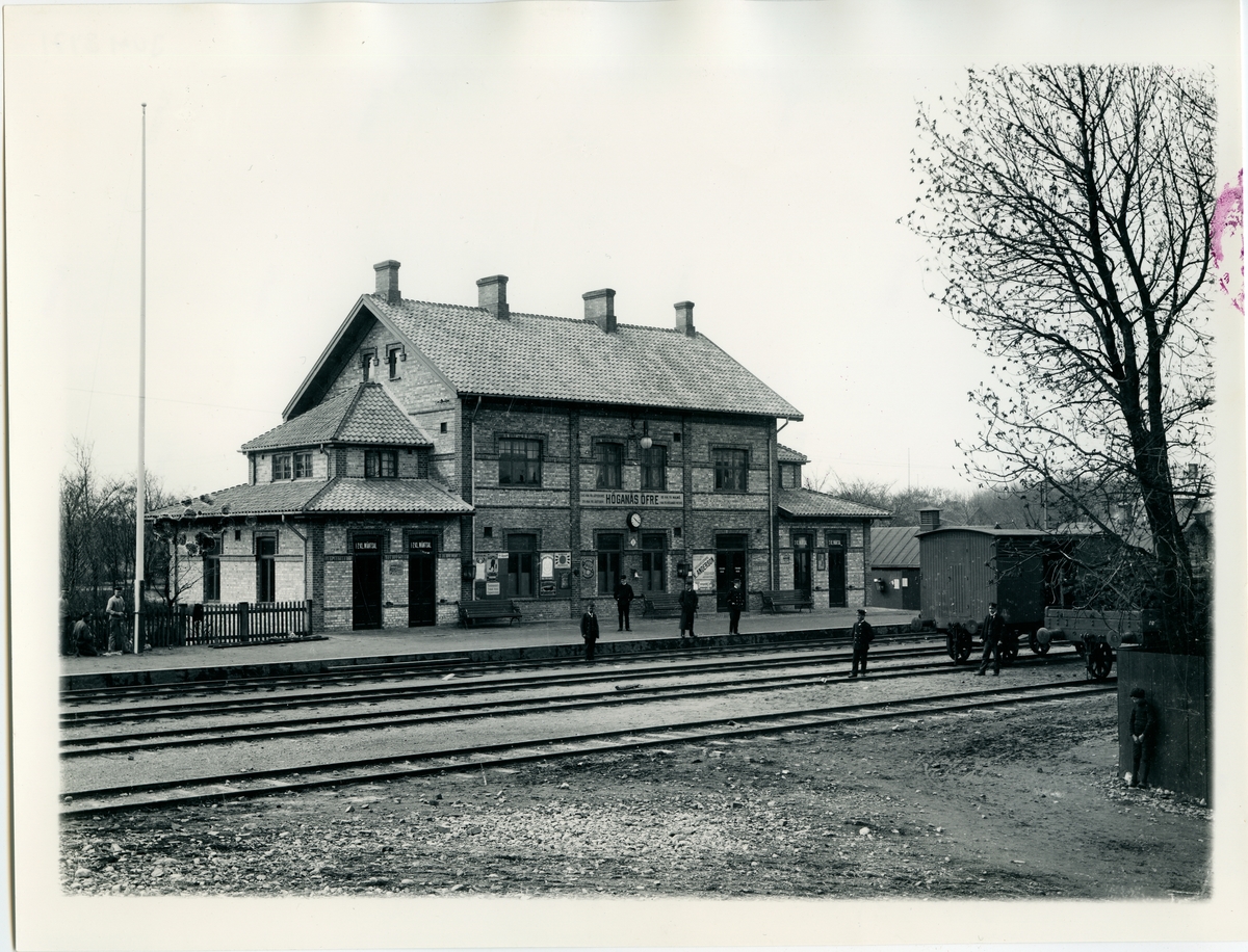 Höganäs Övre station. Järnvägen från Kattarp till Höganäs öppnades 1885 av SHJ, Skåne - Hallands Järnväg. I Höganäs fanns då två stationer, Höganäs Övre och Höganäs Nedre. Efter 1919 blev det en station istället för Höganäs Övre och Höganäs Nedre. En stor ombyggnad av Höganäs station ägde rum 1936. Nedlagd 1992.