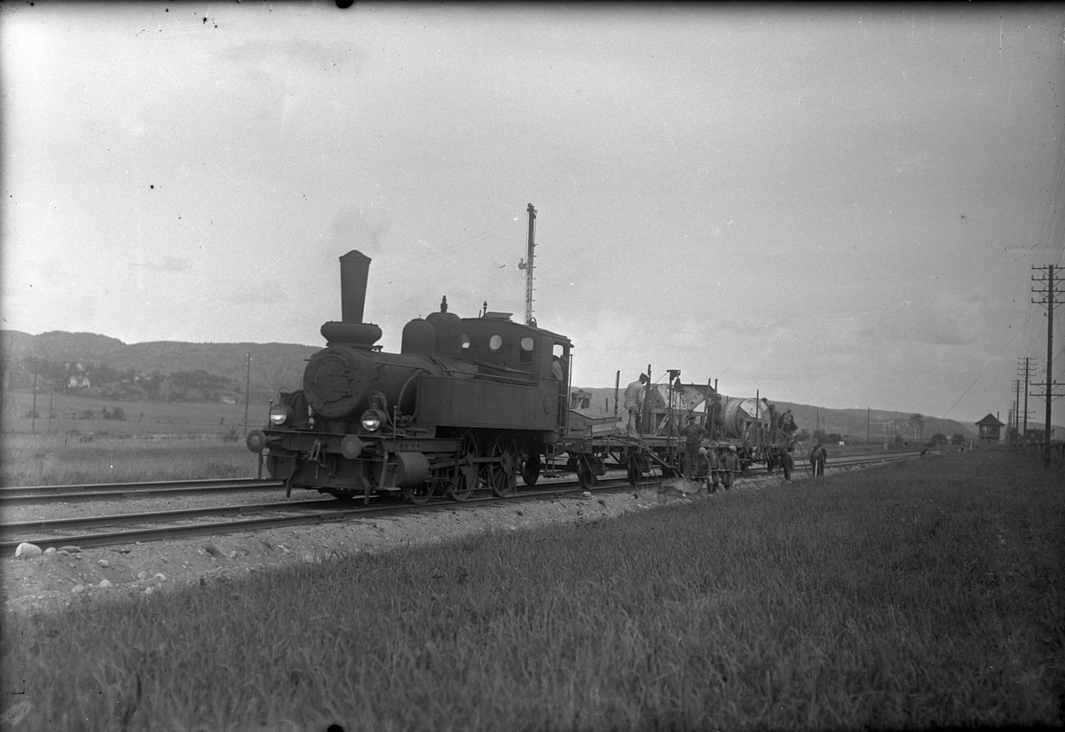 Titel: Statens Järnvägar, SJ Ke 772 med kabelläggningståg på 6 bansektionen. På linjen i närheten av Partille.