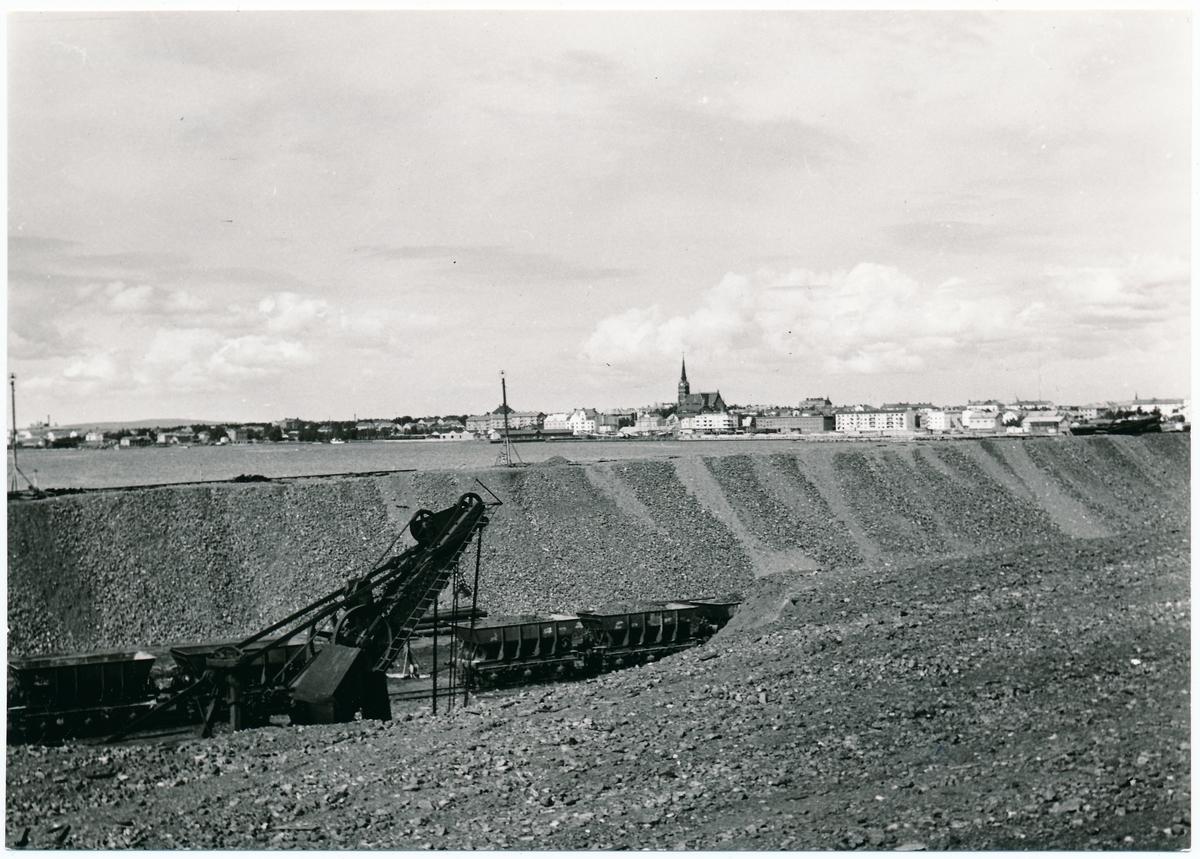 Malmupplag i Luleå station. 1888-03-12 det första malmtåget kom ned till Luleå. Stationshuset färdigtbyggdes 1887. Exploateringen i malmgruvorna började öka. Kapaciteten har successivt också ökat genom förstärkning av bana, broar, mötesstationer och elektrisk drift. Malmbanan byggdes av Sverige & Norges Järnväg.