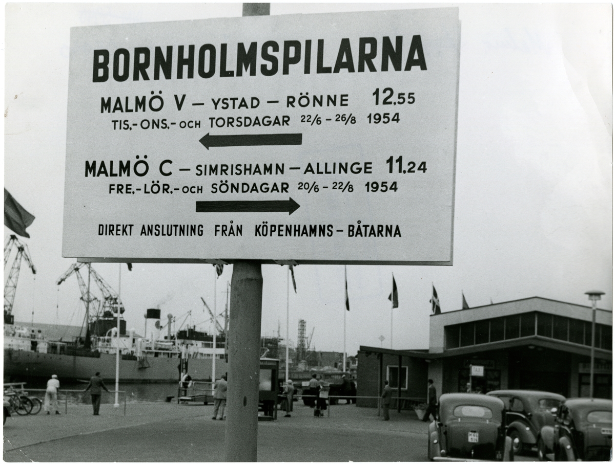 Skeppsbron i Malmö. Volvo 800 "Suggan". Fartyg i hamnen. Skylt med information om Bornholmspilarna.