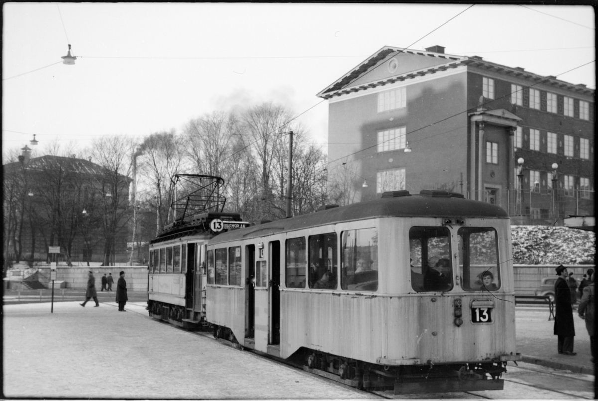 Vid hållplats vid Fridhemsplan på Mälarhöjdsbanan linje 13 Tegelbacken - Ulvsunda står Aktiebolaget Stockholms Spårvägar, SS släpvagn och spårvagn med resenärer.