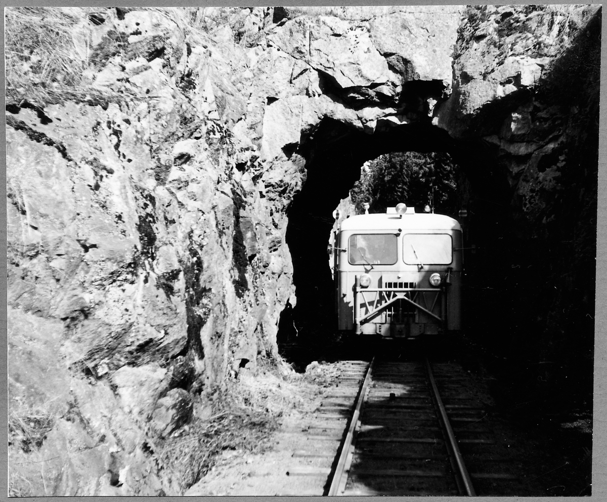 Motortralla, MTR 53p 381, vid Storsjö på linjen mellan Åtvidaberg och Västervik. Tunneln under rivning för breddning av banan till normalspår.