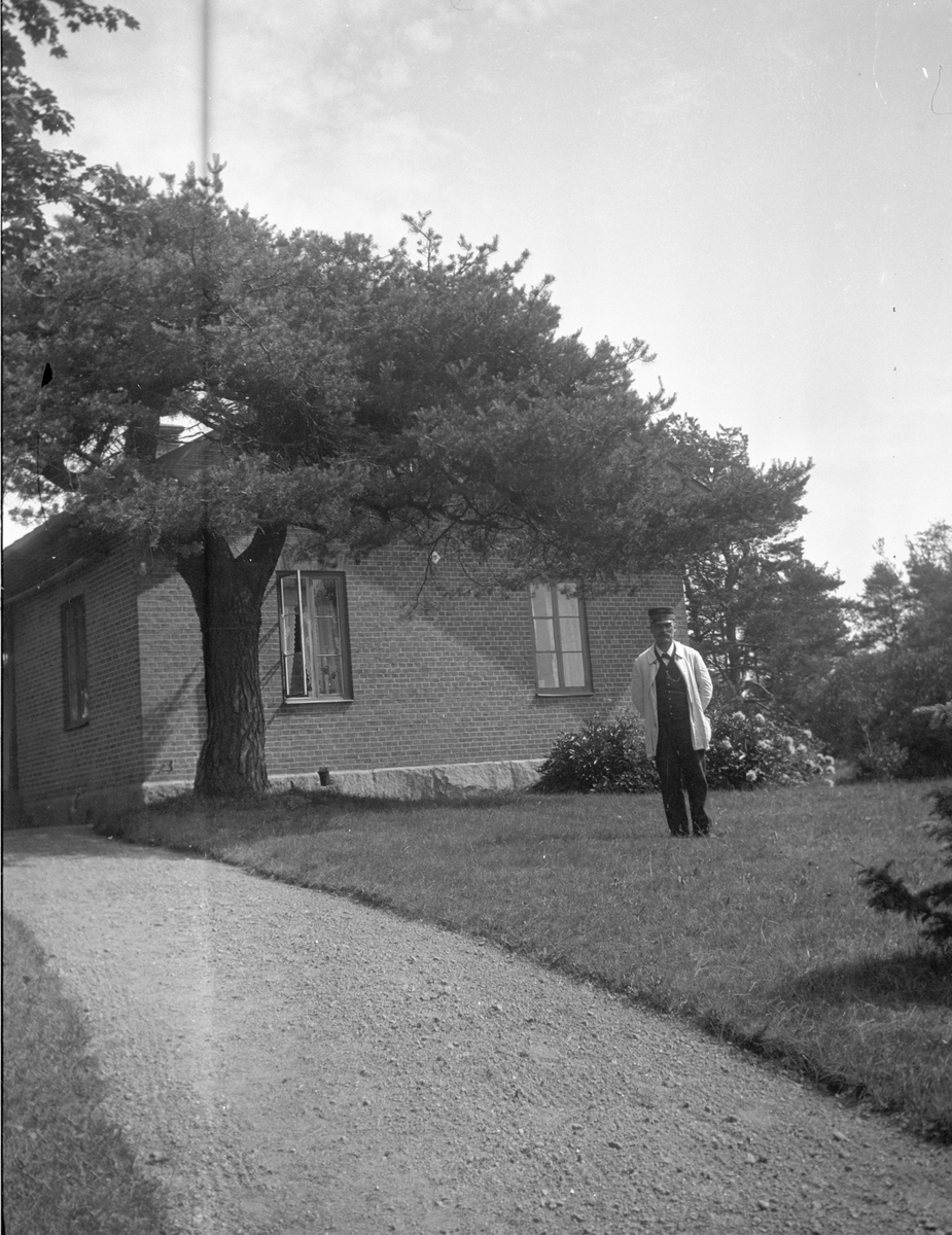 Cederliknanade tall vid Ölme station. Stationen tillhör Nordvästra stambanan. Nordvästra stambanan byggdes från Laxå förbi Kristinehamn, Karlstad och Arvika till norska gränsen vid Charlottenberg under åren 1865-1872. På bilde syns stationsföreståndare förmodlingen Adolf Svärdström som var verksam uner perioden 1917-1927.