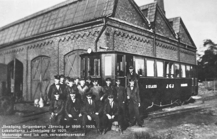 Jönköping-Gripenbergs Järnväg. Motorvagn med lok och verkstadspersonal vid Lokstallarna i Jönköping år 1925.