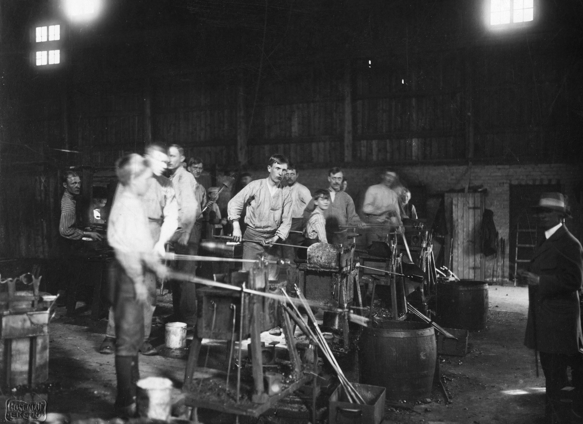 Glasblåsare i arbete vid Sunds glasbruk i Järsnäs socken.