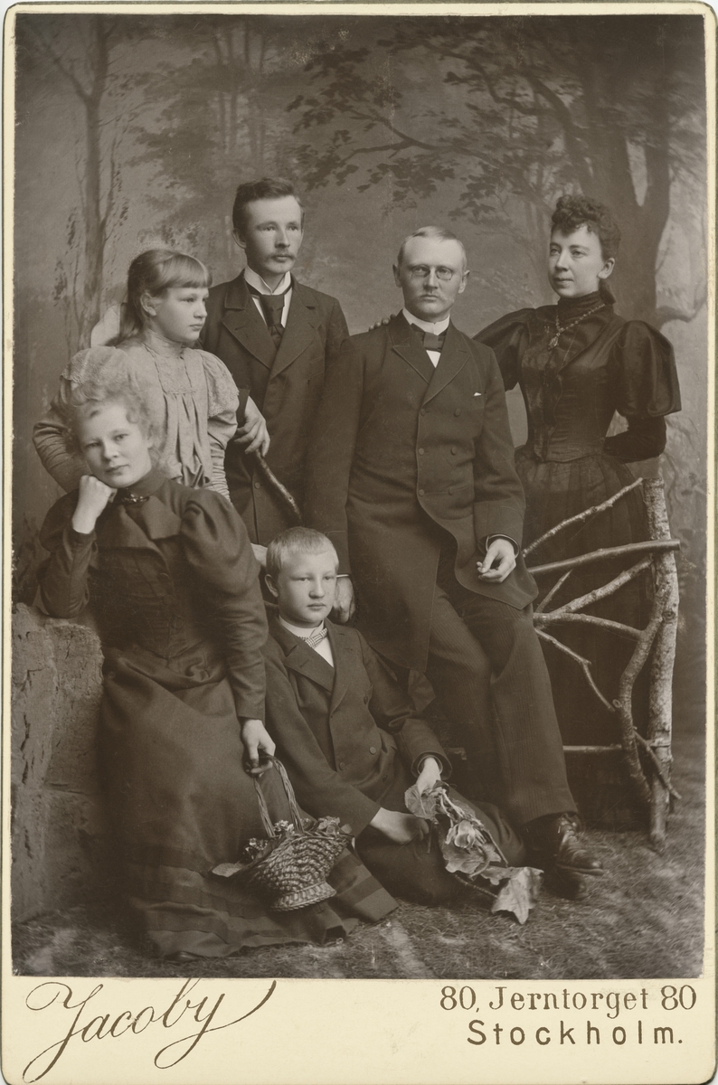 Grupporträtt av några av syskonen Ellqvist. I mitten kammarskrivare Carl Cervin Ellqvist med sin första fru Hilma till höger. Till vänster står hans syskon Oskar, Ester, Gerda och Ernst som sitter på golvet.