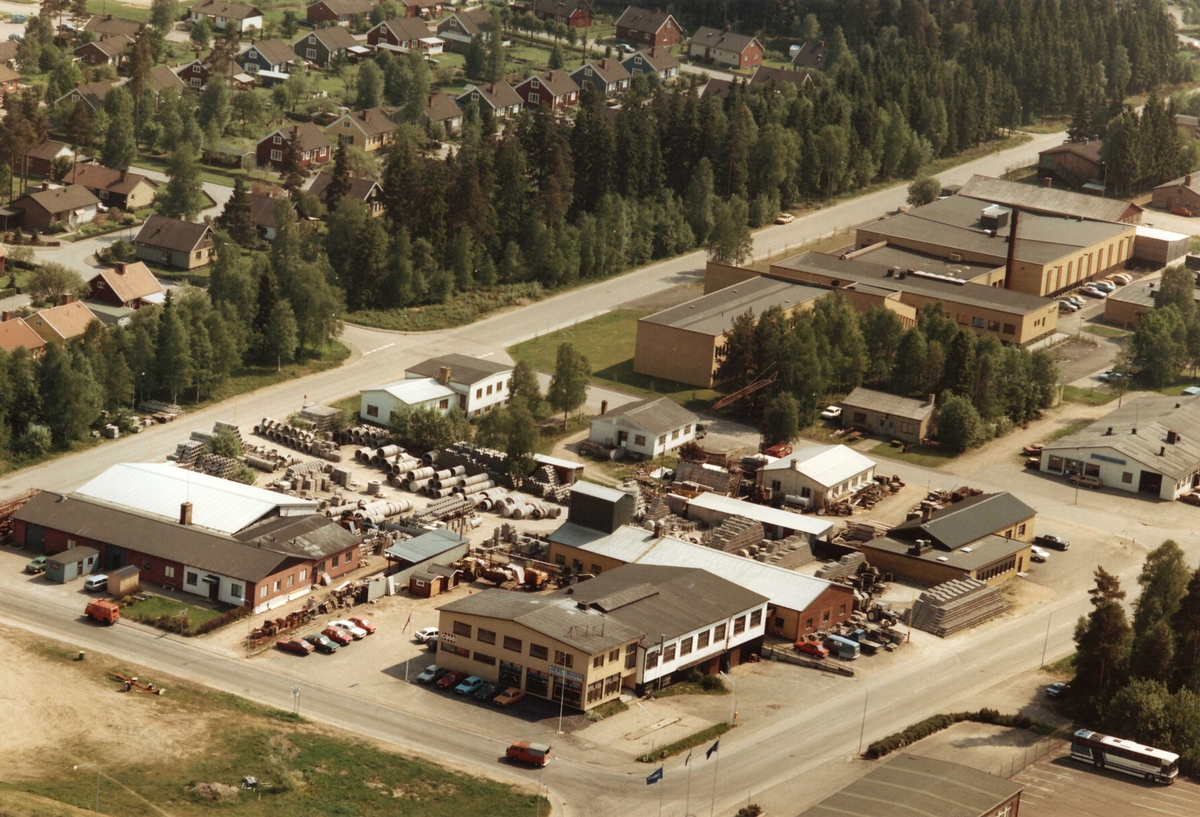 Flygfoto över Sävsjö industriområde och närliggande bostadsområde. I hörnet av Parallellgatan och Hjärtlandavägen ser man fastigheten AB Bil & Maskin. Jönköpings län.