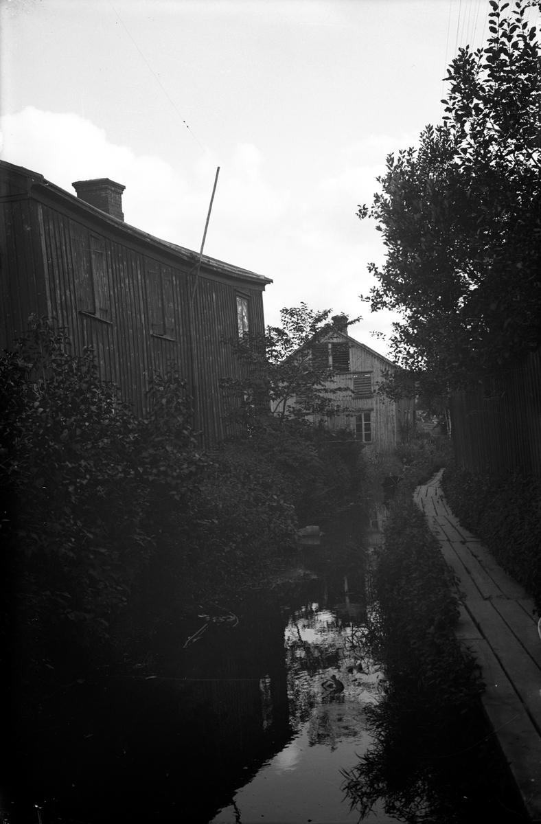 Utmed bäckens ena sida ligger trähus och vid andra sidan en gångstig av lagda brädor.