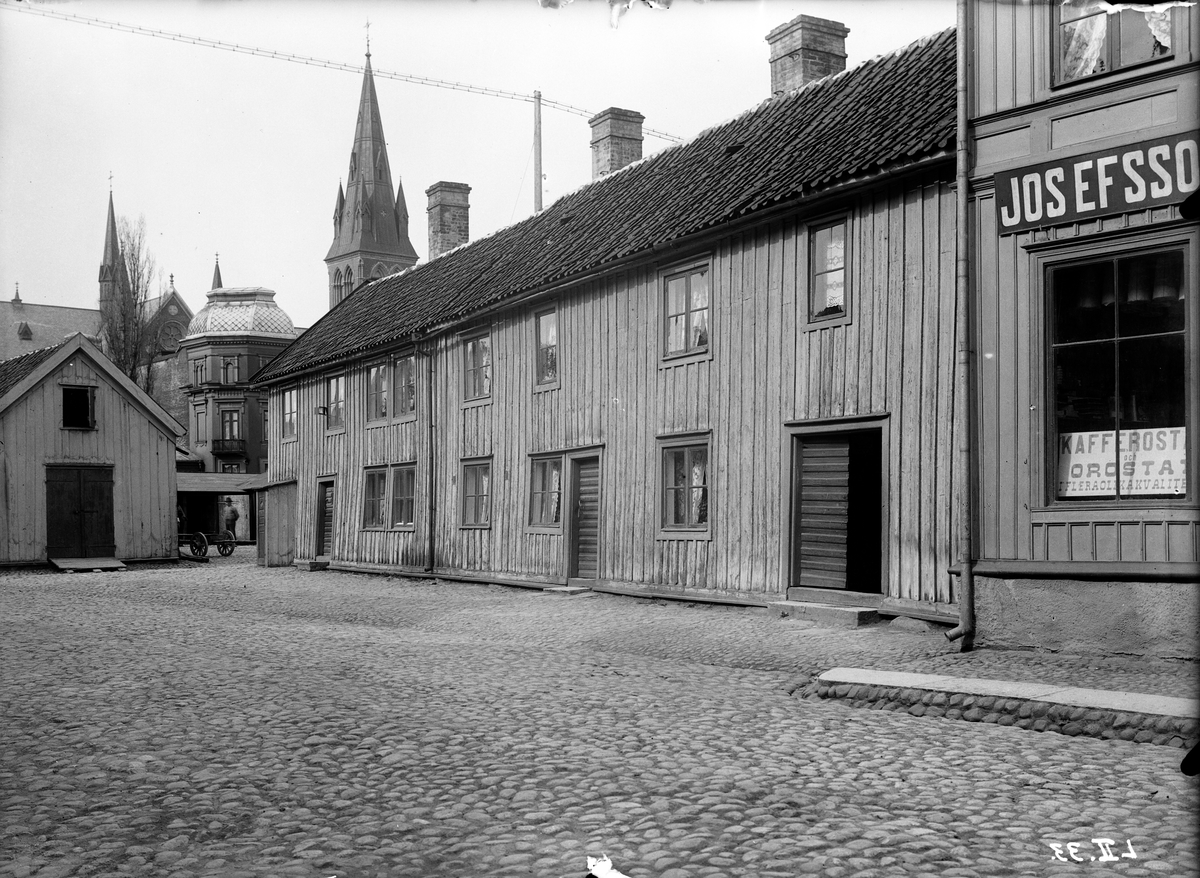 Lilla Trädgård i Jönköping, som blockerade Skolgatans sträckning. Sofiakyrkans och Viktoriahusets torn ses i bakgrunden. Längst till höger ligger "Josefsson & Fohrman Speceri- och diversehandel".