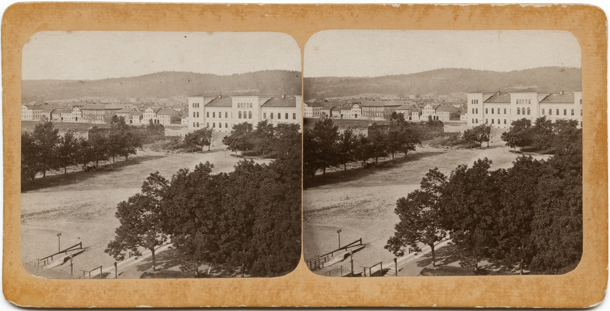 En vy över gamla Läroverket, som numera är Rådhus, med parken i förgrunden. Till vänster bakom träden skymtar den sista delen av Jönköpings fästning. I bakgrunden syns husraden utmed Kyrkogatan.