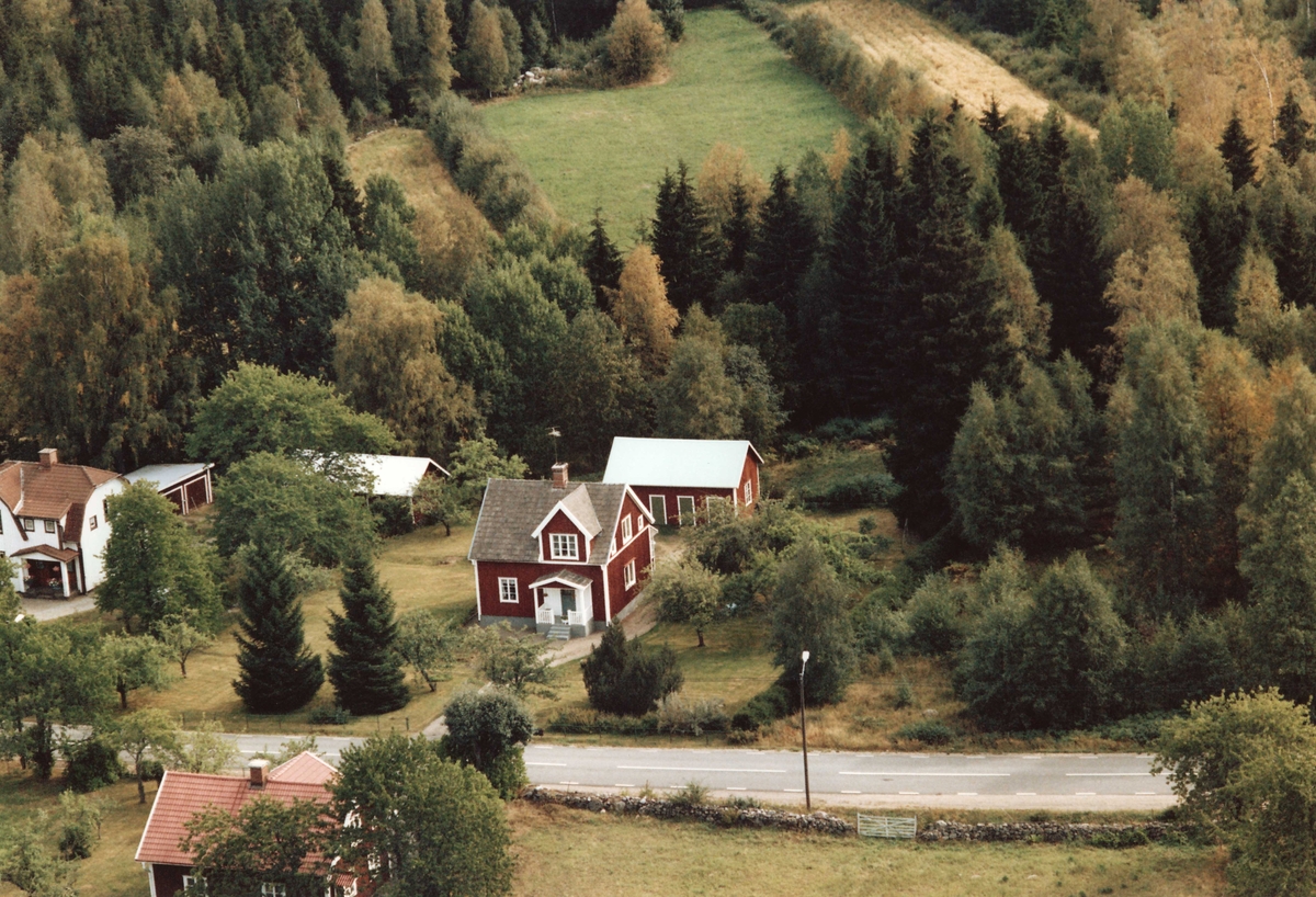 Flygfoto över fastigheter i Nyholm. Till höger i bilden Skogshyddan 1 och till vänster Björkängen 1. Nässjö kommun.