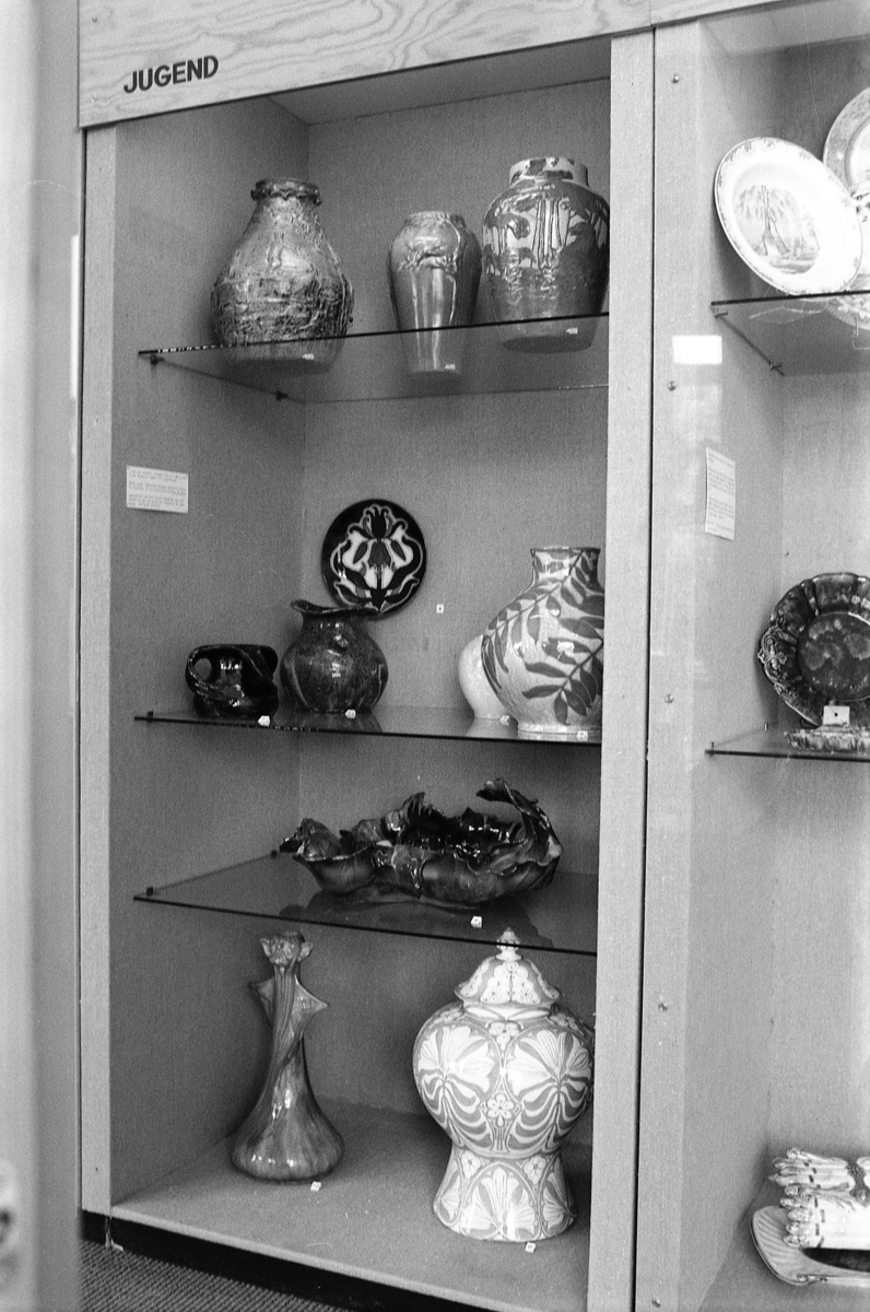 Jönköpings läns museum, keramikutställning. Rum 2, montrarna södra väggen. Jugend.