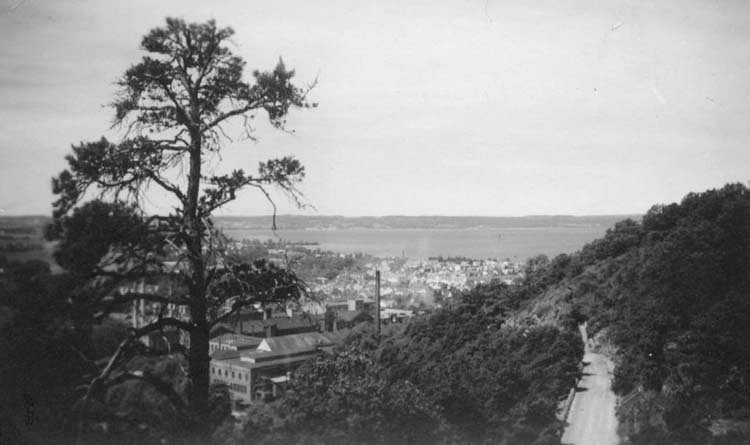 Utsikt över Huskvarna och Vättern. I förgrunden syns Ådalsvägen och bakom trädet en del av Husqvarna vapenfabrik.