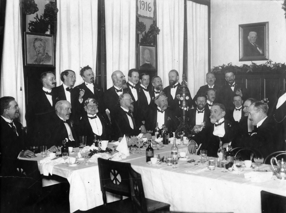 Troligtvis en gillefest. John Bauer står som nr 2 från vänster med pipan i handen.