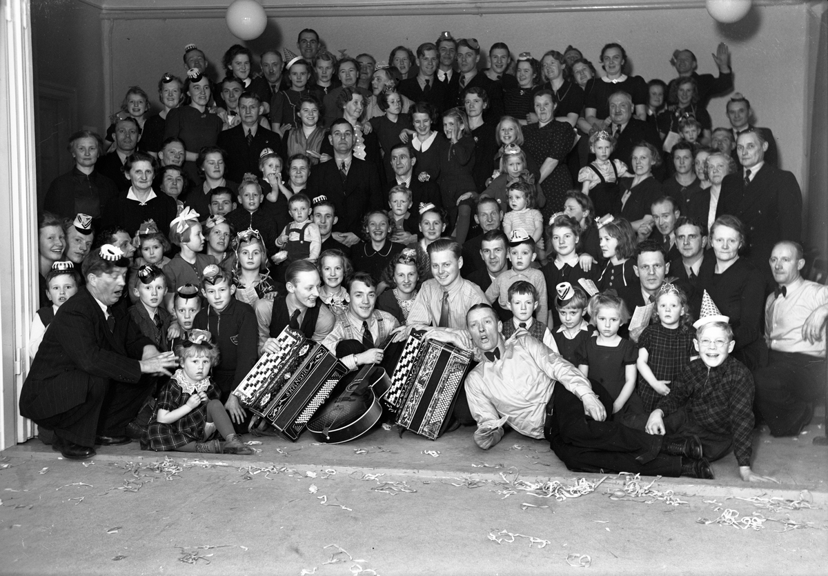 Festklädda män, kvinnor och barn i en samlingslokal. I mitten tre män med dragspel och guitarr.