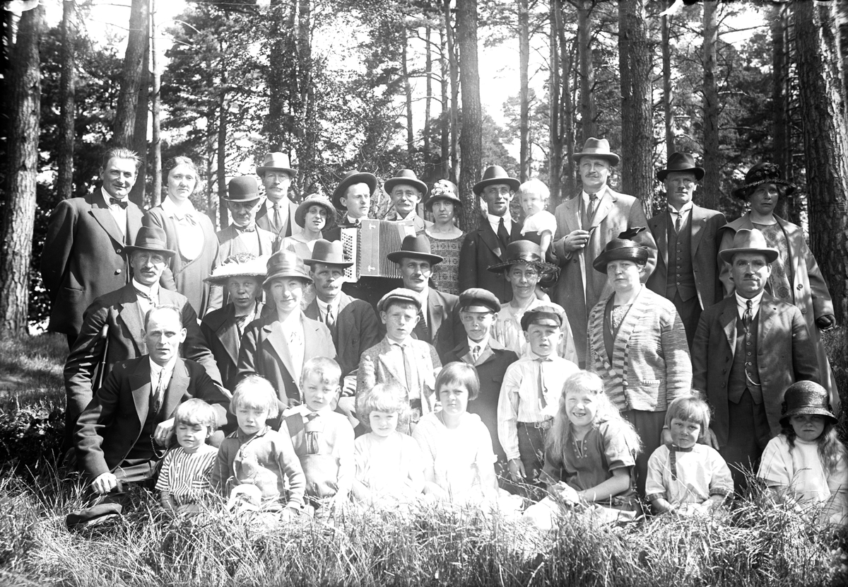 Män, kvinnor och barn i en skogsbacke. Alla verkar finklädda.